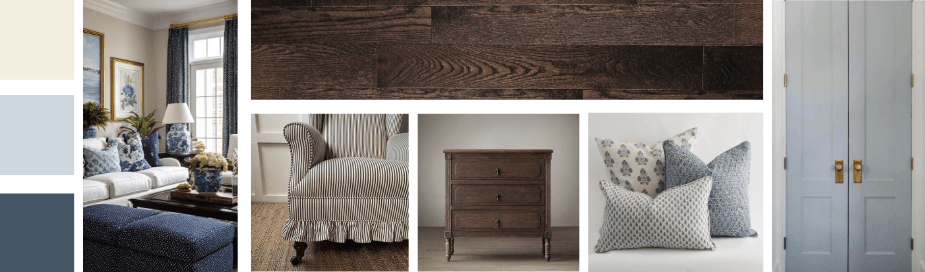 Our intern’s mood board captures the charm and balance of traditional interiors through an intentional mix of color, texture, and pattern. Rich wood tones in the furniture and flooring bring a sense of history, while floral and striped fabrics on pillows and lamps add personality.
