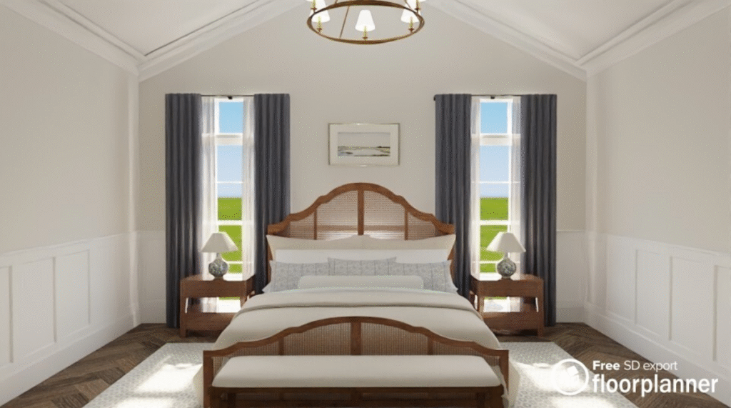 The 3D design concept brings the traditional aesthetic to life. The bedroom layout is built around symmetry, with each side of the bed mirroring the other. Matching side tables, lamps, curtains, and even window placements establish a sense of order and calm.